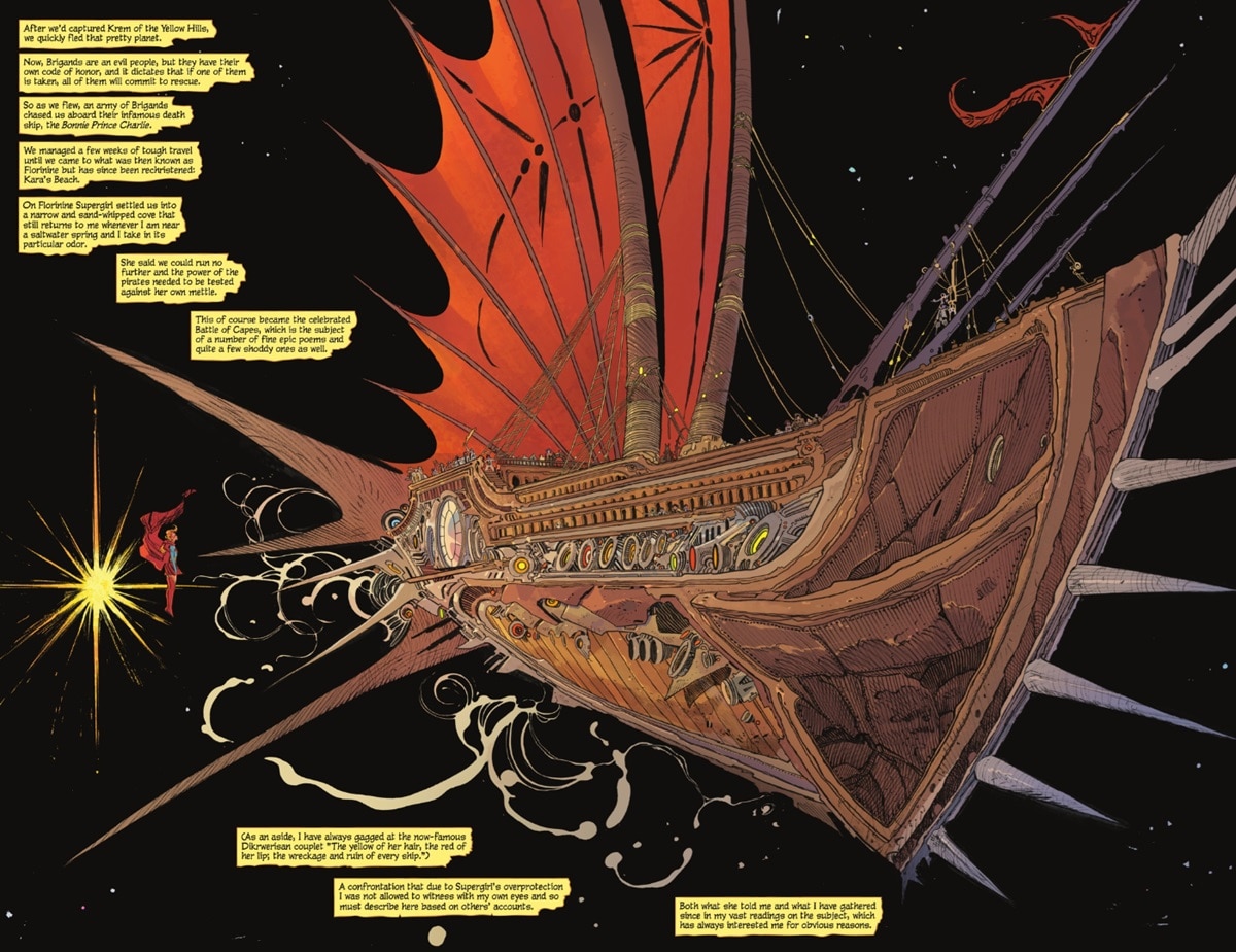 As James Gunn, Milly Alcock and Craig Gillespie recently told us, in Supergirl, Kara is looking for a planet with a red sun on which she can get drunk. In the comic, she’s celebrating her 21st birthday. In the trailer, we hear her toasting her 23rd. In both versions, she’s recruited by young Ruthye Marye Knoll (played in the film by Eve Ridley), who seeks vengeance for her father, murdered by Krem of the Yellow Hills (Matthias Schoenaerts).