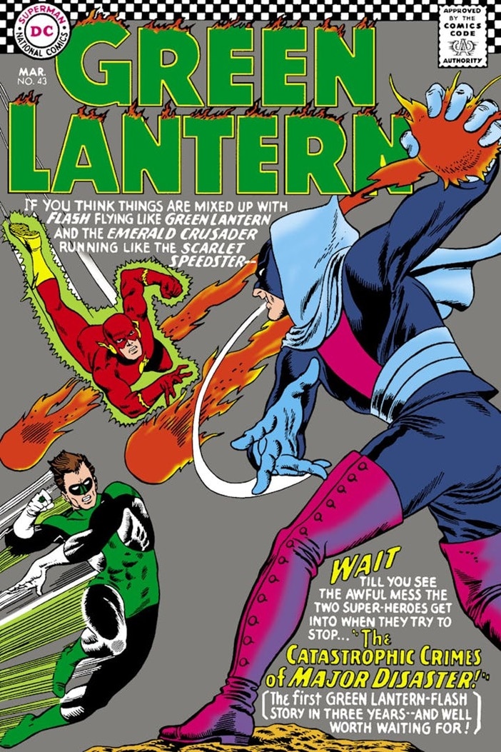 Both Carmine Infantino and Gil Kane’s sleek midcentury styles were well-suited for the two space age heroes they’d co-created. Those styles would only improve throughout the decade. By the time of March 1966’s Green Lantern #43, written by Gardner Fox and penciled by Kane (aided by Syd Greene’s charming, cartoony inks), the latter artist’s work at DC had reached an apex. Here, the super bros’ girlfriends learn their secret identities (albeit temporarily) as they battle a new villain, Major Disaster.